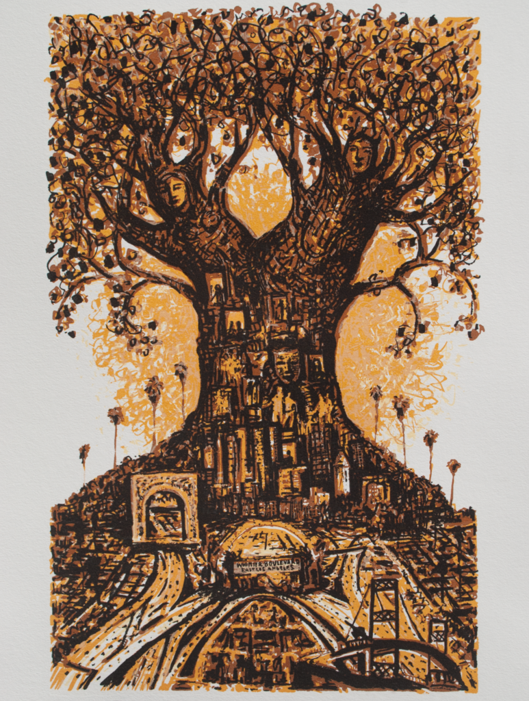 Poli created her print, A Communal Tree for LA, in 2016 for the California Community Foundation Centennial Campaign. The print depicts a contrast between nature and industrialization. Poli portrays a giant tree representing a man and a woman with people and buildings within the trunk. Toward the bottom of the print there are different freeways as extensions of the tree, representing the tree roots. Also depicted are LA landmarks like the “Welcome to Whittier’ sign, the 6th St. bridge, and palm trees along the side of the tree. The print’s warm tones emits a hazy feeling to the artwork, evoking memory and nostalgia.